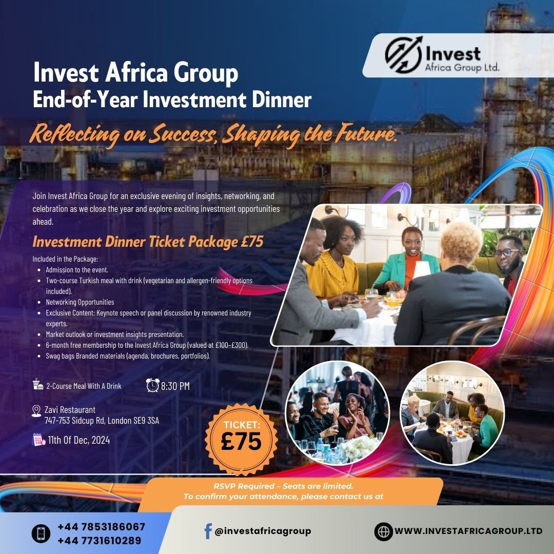 Zavi Restuarant, 747-753 Sidcup Rd, London SE9 3SA Zavi Restuarant, LondonJoin Invest Africa Group for an exclusive evening of insights, networking, and celebration as we close the year and explore exciting investment opportunities ahead. Investment Dinner Ticket Package £75 Included in the Package: Admission to the event. Two-course Turkish meal with drink (vegetarian and allergen-friendly options included). Networking Opportunities Exclusive Content: Keynote speech or panel […]